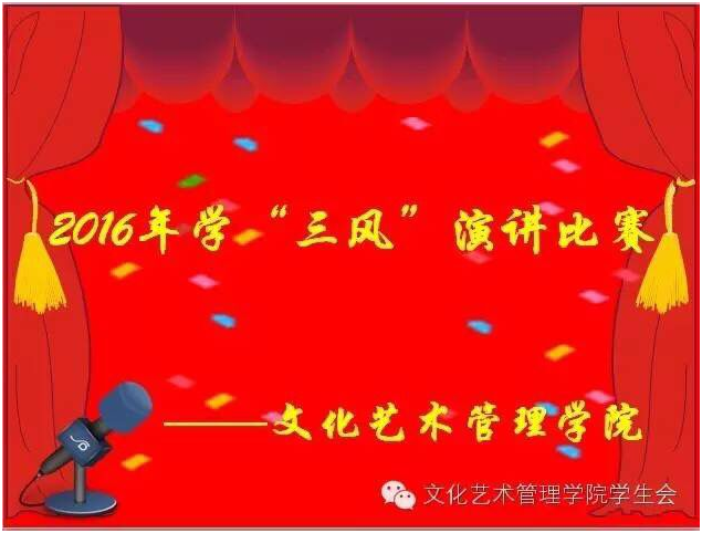 学三风,树三风走进了我们的大艺校园, 在此各位选手都拼尽全力,舌战群儒。抓住自己的每一分钟,演讲出每一篇简洁而不轻浮,清爽而不做作的文章。今天来参加比赛的同学都很不容易,从对比赛的重视程度来看,大部分选手都做了很好的准备,热情洋溢地歌颂校园之风,热爱我们的校园。这充分的准备更体现在演讲稿的写作上。好的演讲稿是成功演讲的基础。他们所讲演的文章,虽不为大家所作,犹可承大家之风范。不少同学的演讲稿给人感觉新鲜、与众不同、吸引人。同时,在开场白的设计方面有独到的地方,而不是千篇一律。