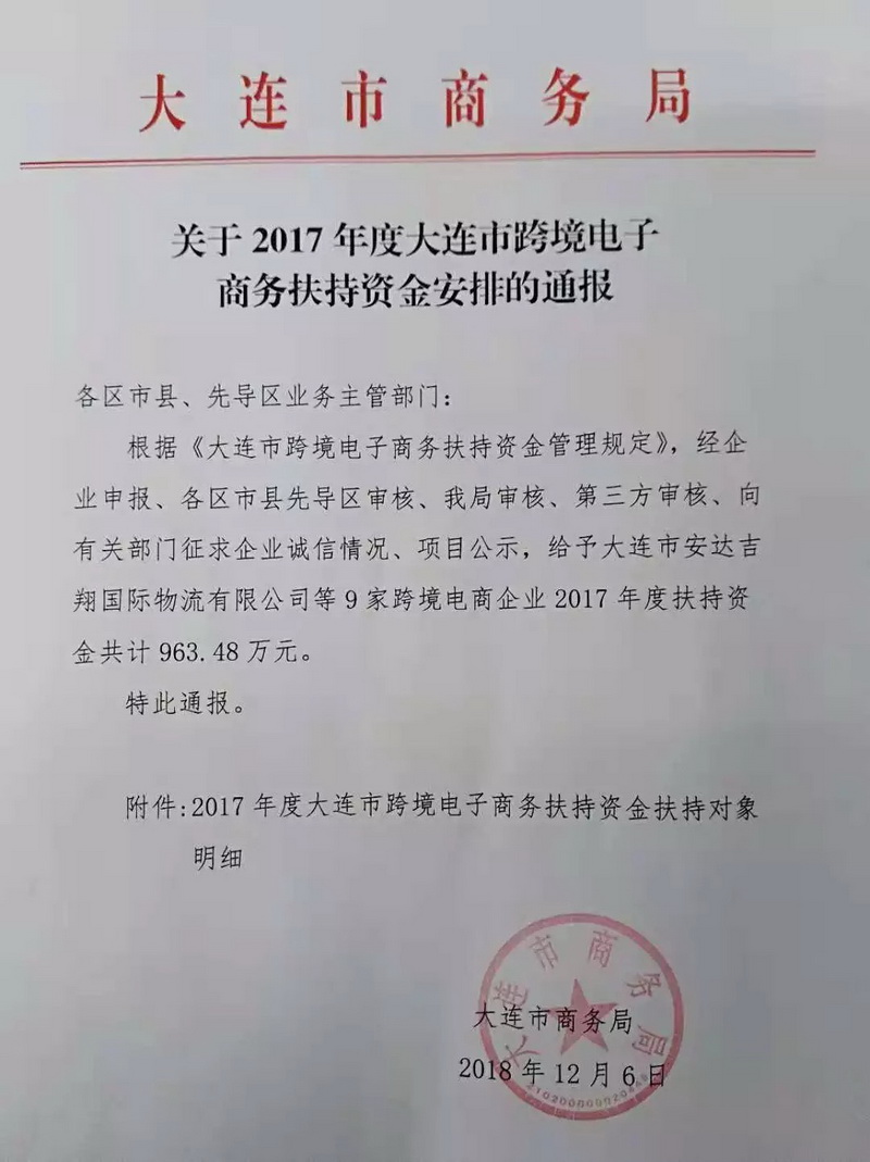 经金普新区与大连市商务管理部门审核,12月6日,成功获批大连市商务局跨境电子商务扶持资金20万元。