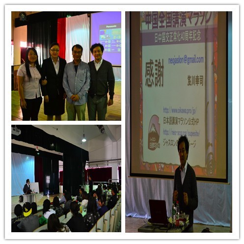笈川老师对待生活、对待人生的态度也感染了在场的学生和老师。在本次报告会上他不仅教给学生学习日语的方法也教给学生如何树立自信,告诉大家出色的日语是如何练就的。他说:你可以!我不会放弃任何一位学生,坚持不懈的用尽各种新颖的方法开导、引发学生。他对同学、对教育的热情燃起了同学们求知的欲望,照亮了奔往成功的路。不仅培养出了一批又一批优秀的同学,也感染了其他老师。他创新的教学方法,为日语教育界吹来了新风,为日语学习者带来了福音。
